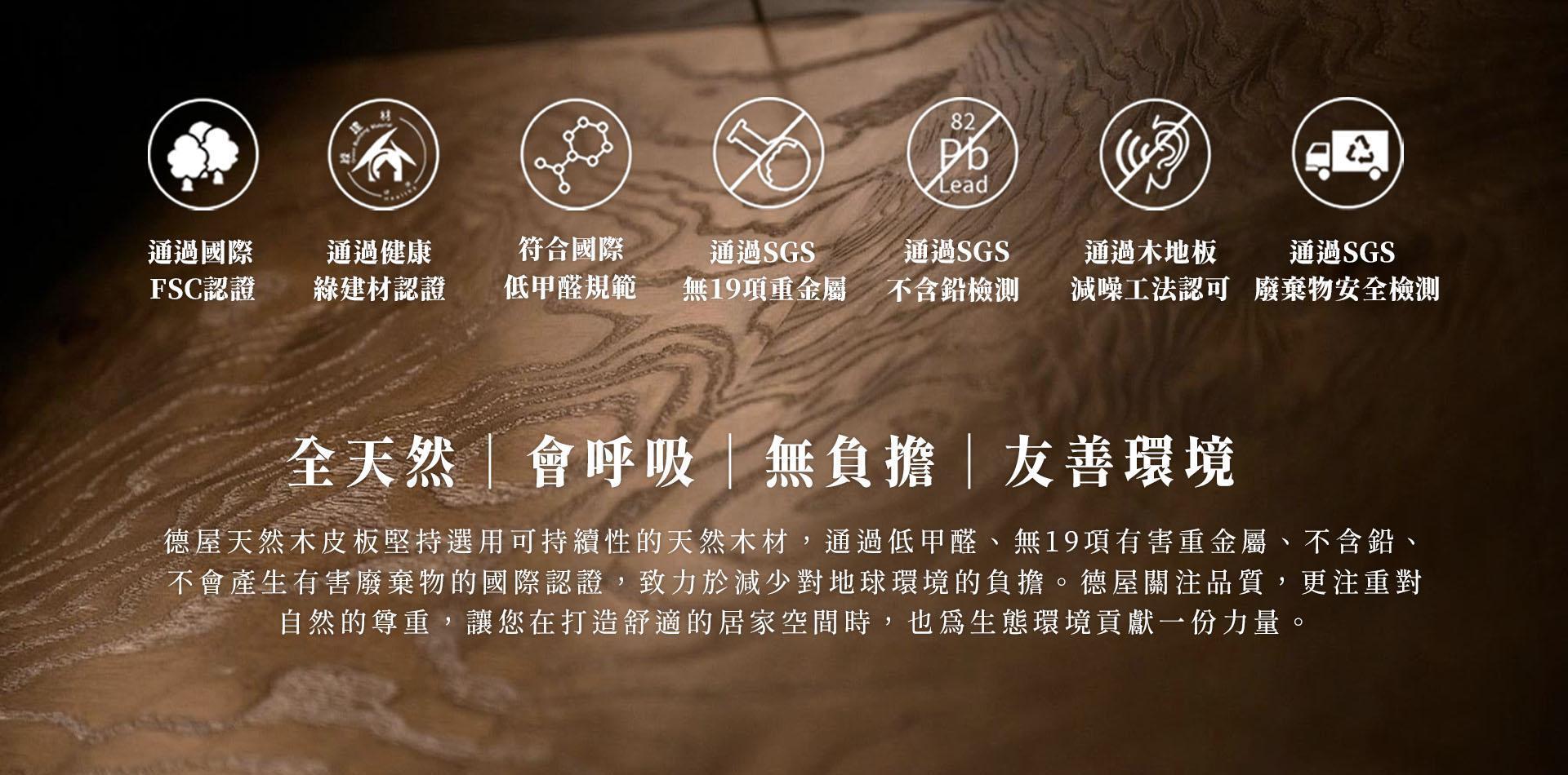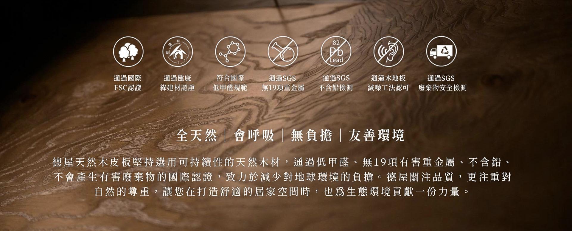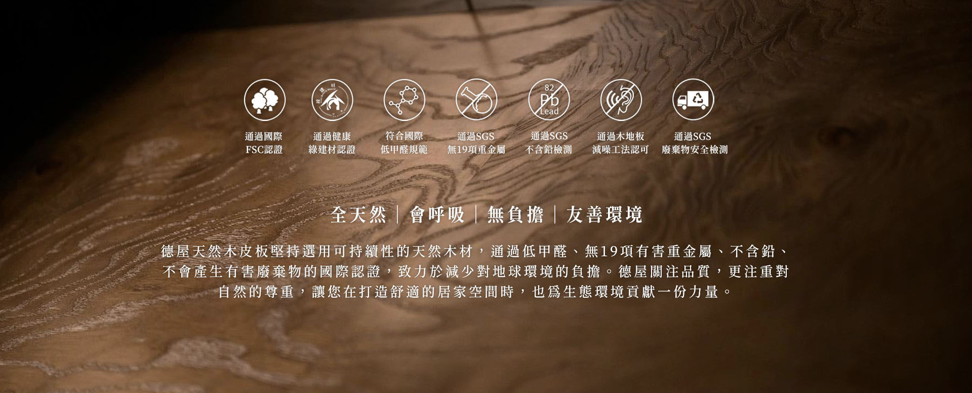 天然、低甲醛、高品質的室內裝潢專用木皮板及木地板,打造健康優質的生活空間是德屋建材的堅持與訴求。德屋建材母企業為台灣首家通過FSC(Forest Stewardship Cou