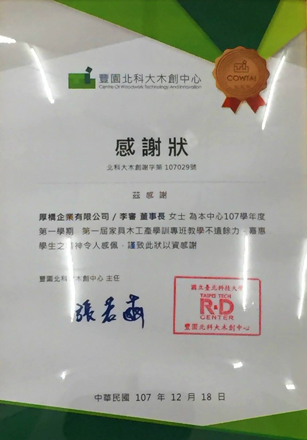 2018 ※致贈國立臺北科技大學木創中心木皮板乙批