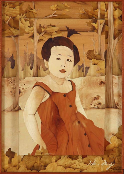 Sandy老師:「在好友家聚會,看到好友千金兒時的照片,我忽然有所靈感,便以小女孩的純真樣貌為主軸,結合盎然廣闊的森林,象徵前途無量,充滿希望。小時候俏麗可愛的女孩,長大才華洋溢、美貌出眾。希望藉由木箔®,除了祝福,也讓珍貴的照片,以不同方式一輩子珍藏。」