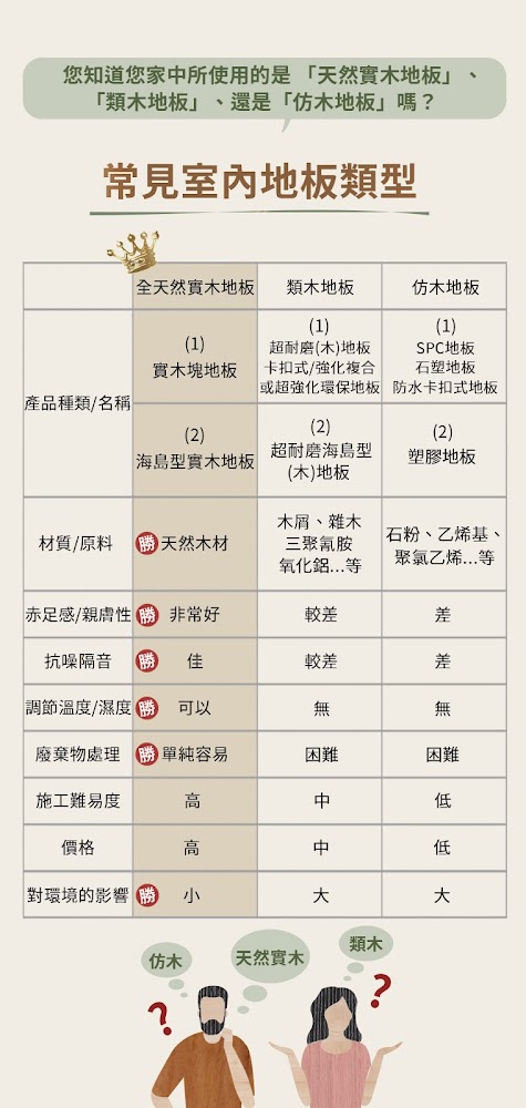 但是,您知道您接觸的是「#全天然實木地板」,或是產品中只含有部分木材成分的「類木地板」,還是「仿木地板」嗎?