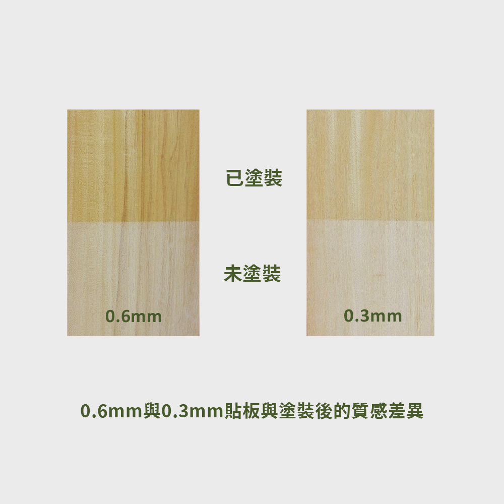 18世紀工業革命後,人類得以運用機器將原木刨切成厚度一致的木皮,透過精進的技術和測試,最後訂出一個「木皮黃金厚度0.6mm」,此厚度的木皮是在追求經濟效益的同時,還能保有木頭應有的質感、美感、溫潤觸感…等特色的最佳平衡點。
